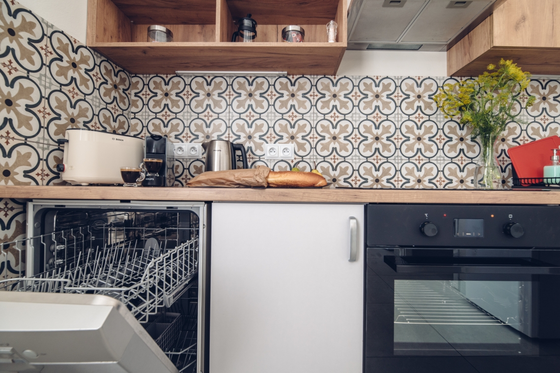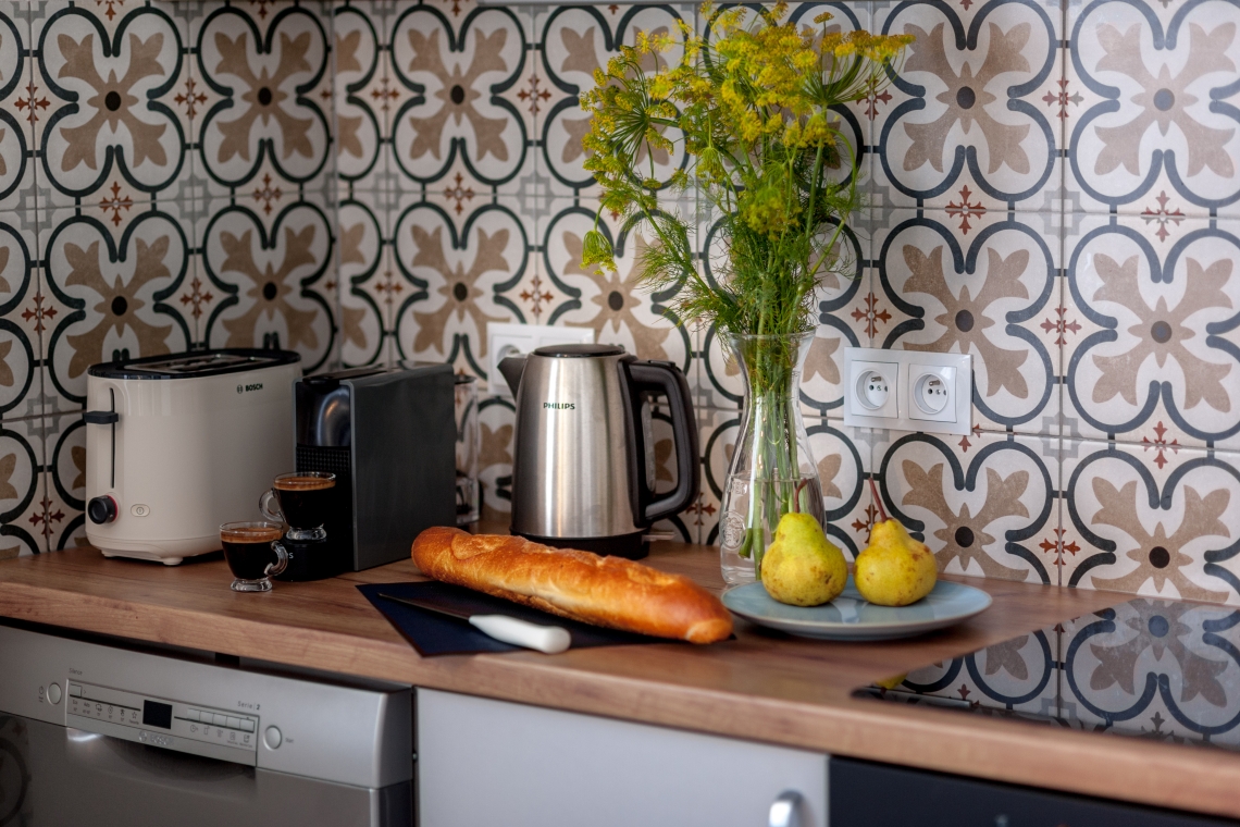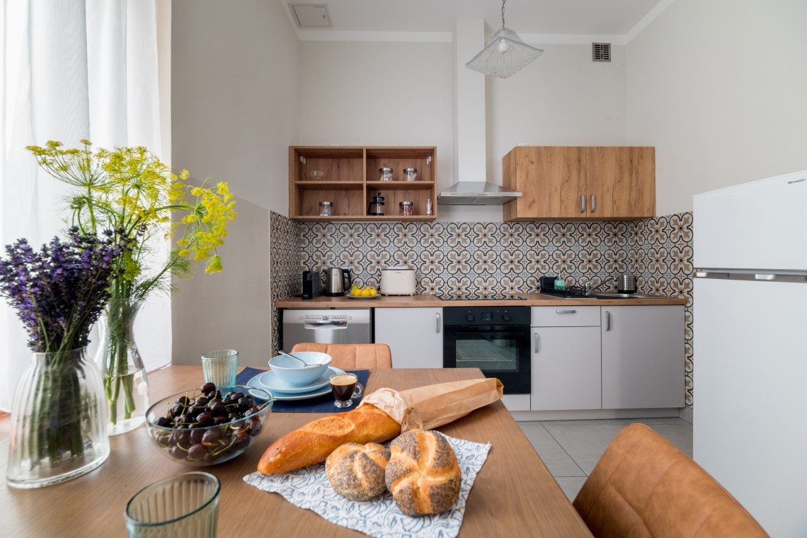 Po wejściu znajduje się hall, duża, bogato wyposażona kuchnia ze stołem jadalnym, salon z dużym stołem i 2 sofami, telewizorem 50" 4K Smart TV.