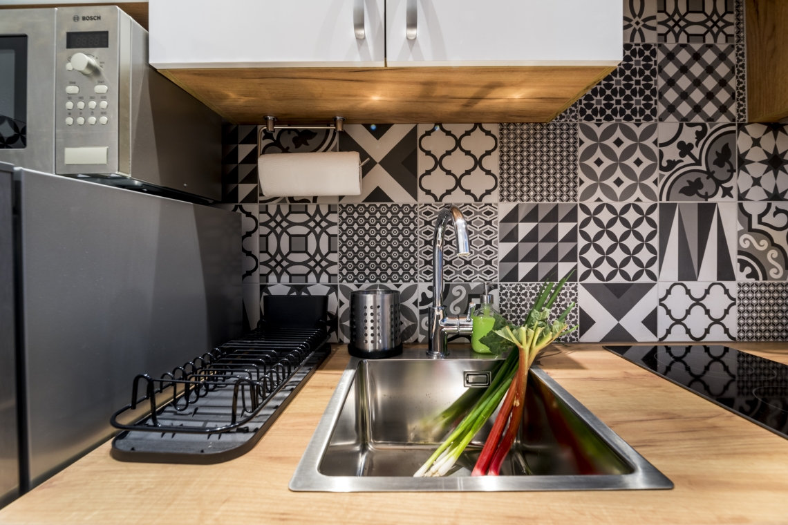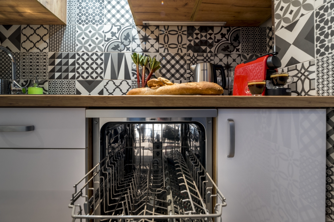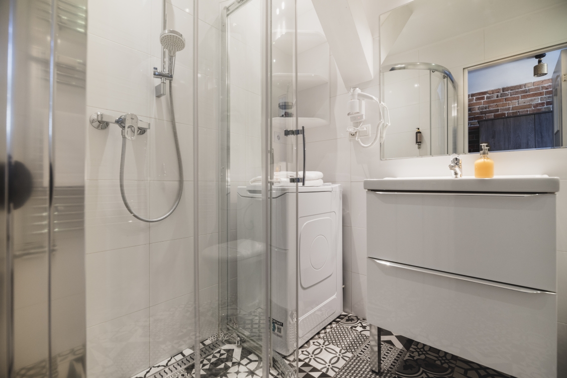 - Na dolnym poziomie znajdziecie hall z garderobą, łazienkę z prysznicem i pralką, dobrze wyposażoną kuchnię oraz salon z dużą rozkładaną sofą dla 2 osób, stół z krzesłami, ławę i smart TV 4K.
