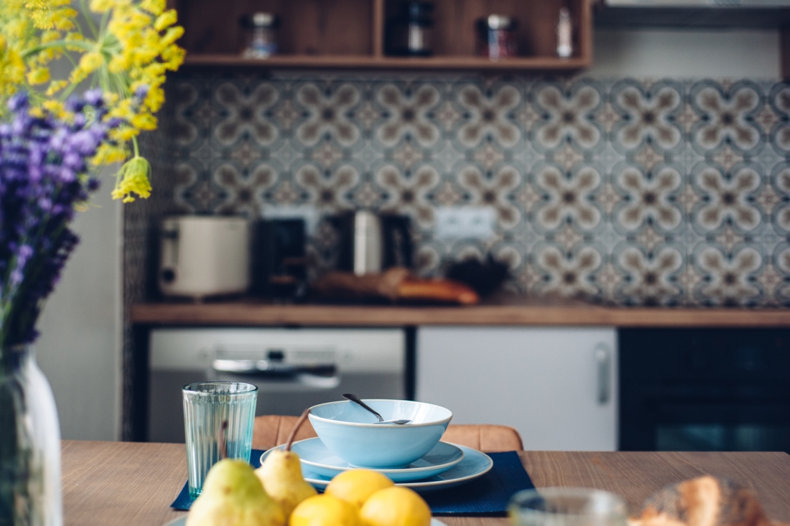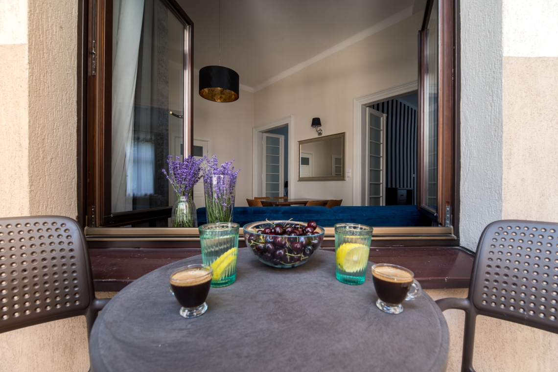 Na balkonie, znajdziecie stolik z krzesłami.