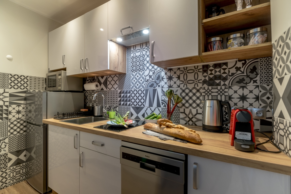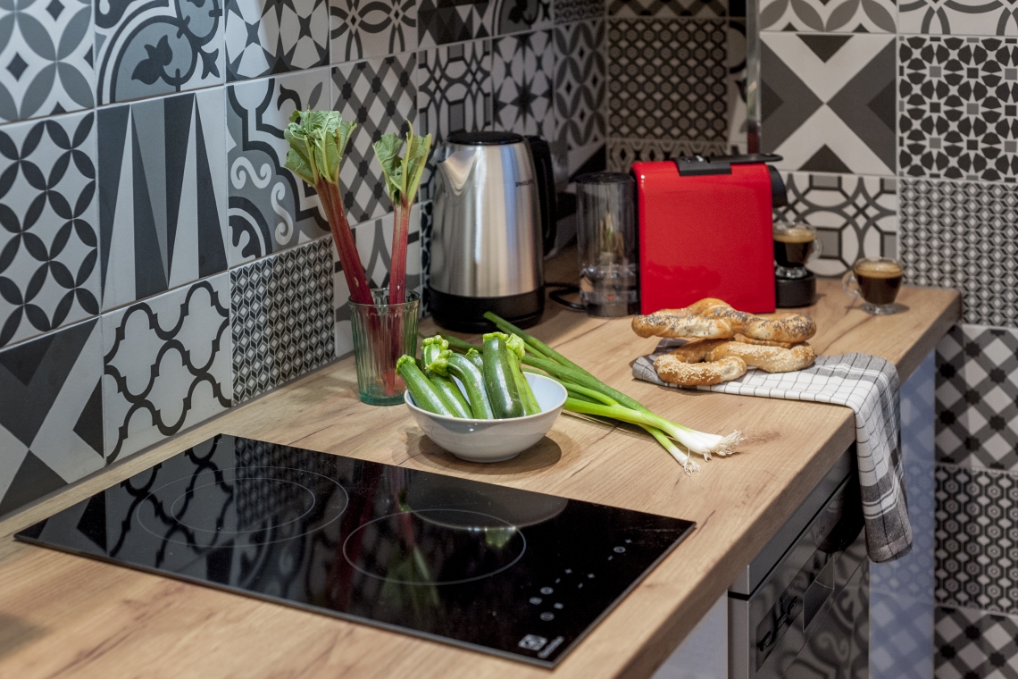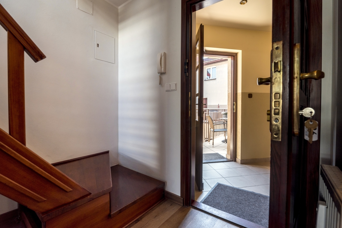 - Na dolnym poziomie znajdziecie hall z garderobą, łazienkę z prysznicem i pralką, dobrze wyposażoną kuchnię oraz salon z dużą rozkładaną sofą dla 2 osób, stół z krzesłami, ławę i smart TV 4K.