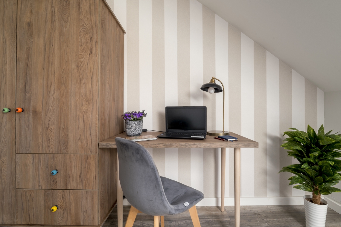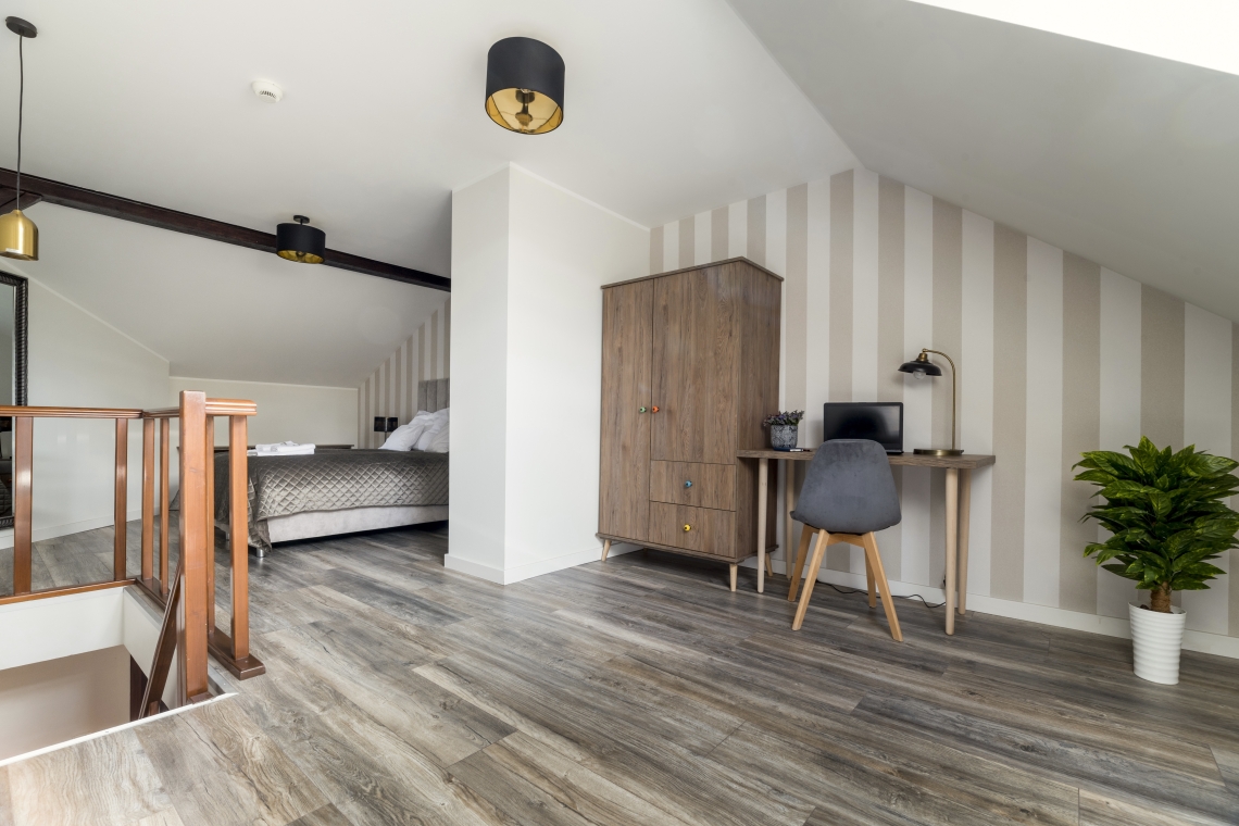 - Na górnym poziomie znajduje się duża i wygodna sypialnia z łóżkiem King-size, szafa, komoda oraz miejsce do pracy.